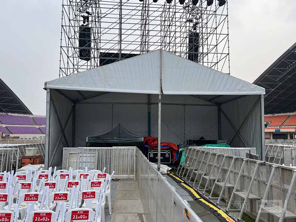 從現(xiàn)場(chǎng)實(shí)拍照片中可以看到,這座演藝篷房氣勢(shì)恢宏,結(jié)構(gòu)穩(wěn)固。篷房外觀采用了現(xiàn)代簡(jiǎn)約的設(shè)計(jì)風(fēng)格,線條流暢,色彩搭配和諧,與演唱會(huì)主題相得益彰。篷房?jī)?nèi)部空間寬敞,能夠容納大量設(shè)備,保護(hù)了設(shè)備不會(huì)因突發(fā)天氣狀況而出現(xiàn)問(wèn)題。