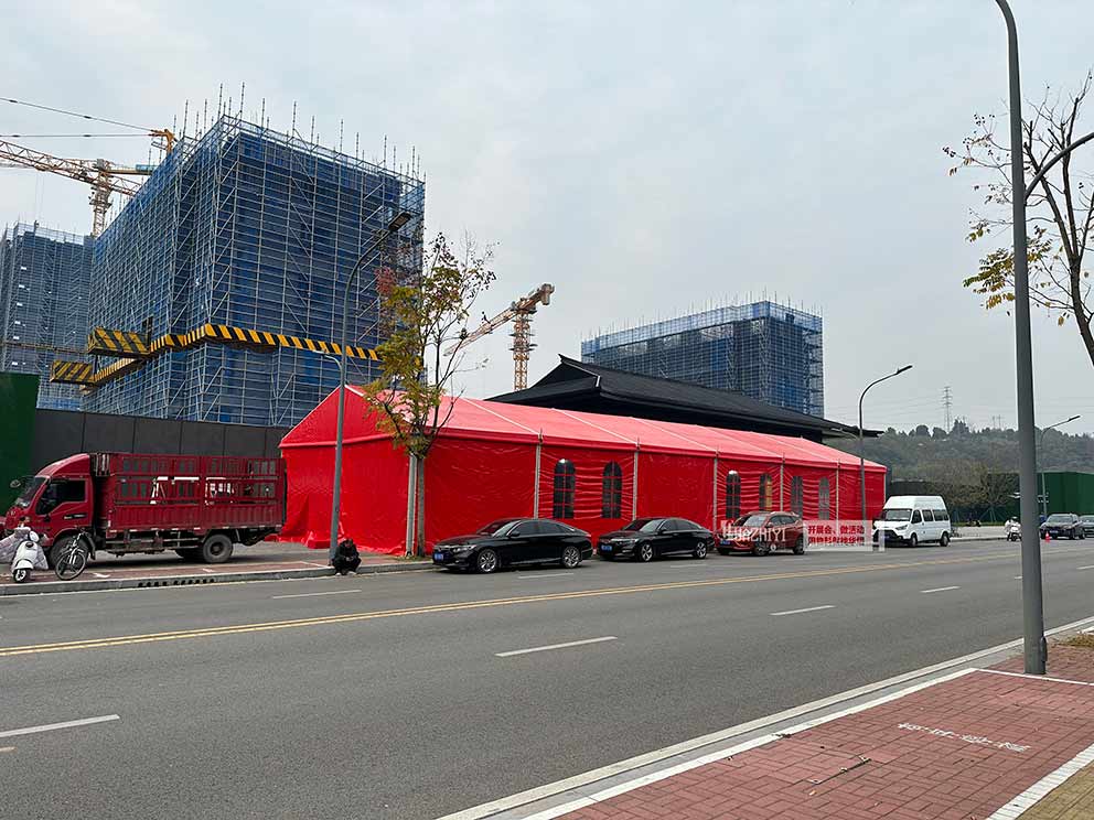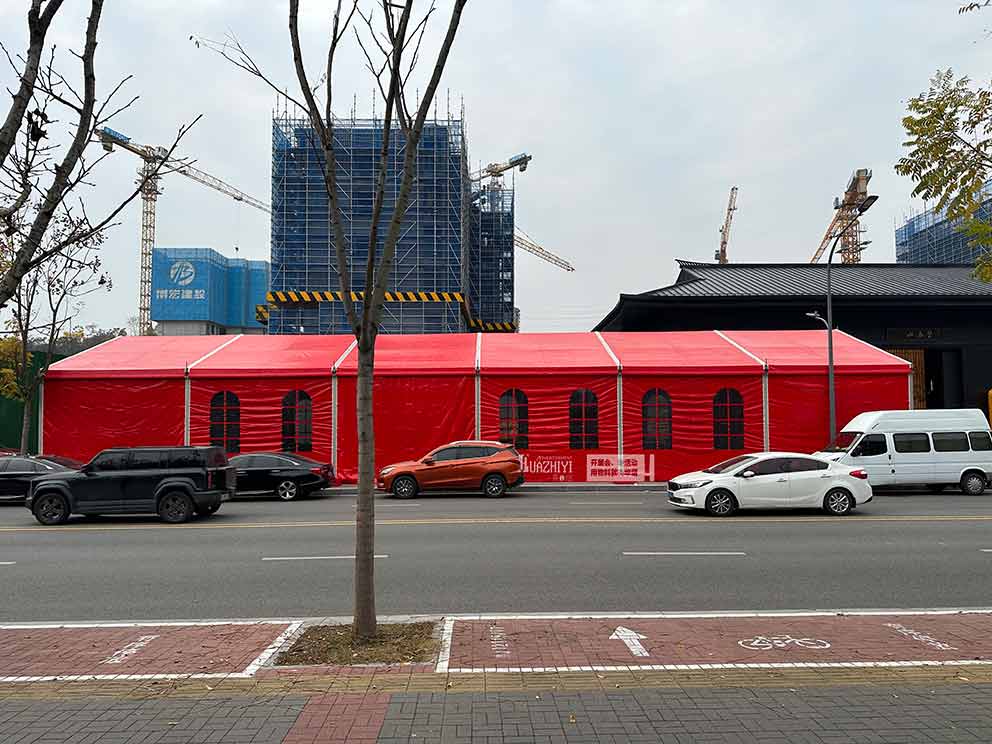 鄭州篷房租賃助力宜昌市樓盤地產開盤活動現場。就在上周周六,宜昌市有一處新的樓盤舉行了開盤儀式。這里的樓盤正在建造著,不久后就會竣工,整潔明亮的樓盤,業主幸福的笑臉,凝結成一副美麗的畫卷。在儀式開始之前,華熠公司就將這座紅色地產開盤篷房搭建完畢了,矗立在街邊,仿佛冬日里的一輪紅日。