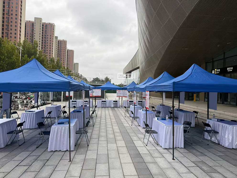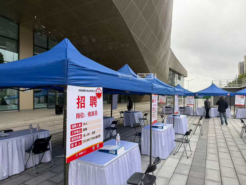鄭州帳篷桌椅租賃為招聘會搭建的藍色折疊帳篷,成為每個企業的專屬招聘“驛站”。帳篷采用輕量化鋁合金支架與高密度藍色牛津布頂篷,單頂尺寸為3米×3米,折疊式設計便于快速搭建與拆卸,完美適配招聘會的臨時場地需求。四周無篷布的開放式結構,讓招聘單元通透無遮擋。