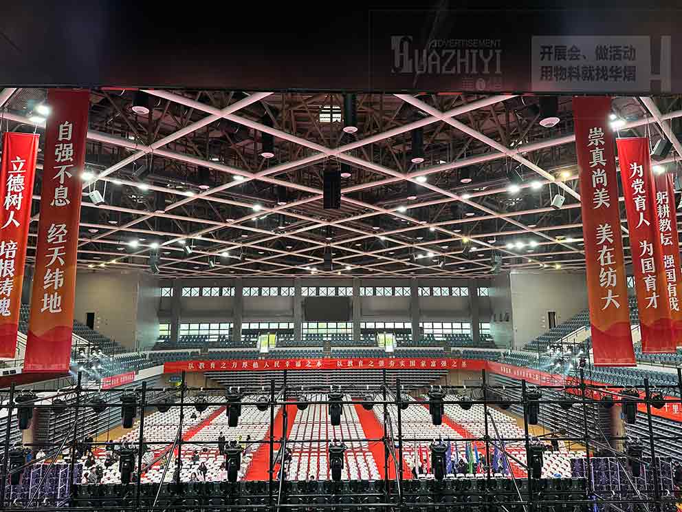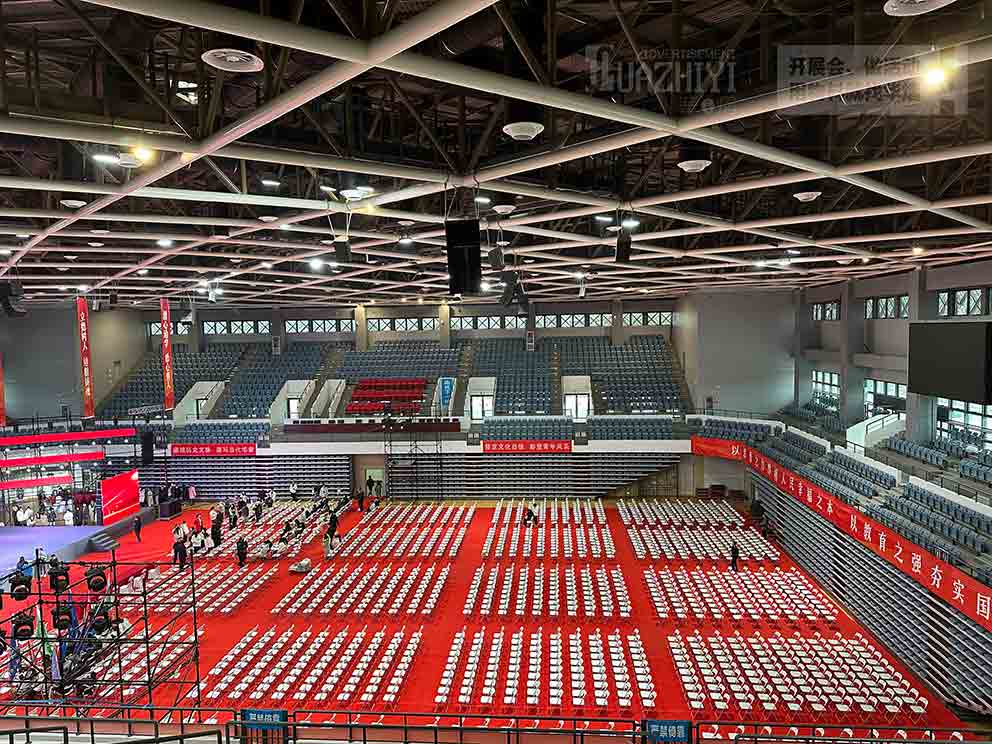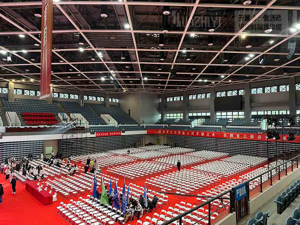 阜陽鄭州租賃桌椅去哪里? 如圖我們可以看到在學校體育館內舉行的典禮活動,就是用了華之熠的白色折疊椅,千把折疊椅擺放整齊,與紅色地毯相呼應,活力莊重,喜氣洋洋又不失穩重!阜陽鄭州租賃桌椅,讓華之熠為您服務。讓華之熠做您的專業物料管家,歡迎隨時來電,期待與您合作!