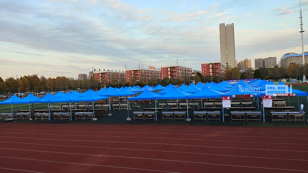 鄭州篷房出租搭建的簡易帳篷都可以用作哪些場合?鄭州華熠公司有篷房,篷房是更為大型的臨時建筑。而平常的一些小體量活動使用簡易帳篷則更加方便,華熠的簡易帳篷就可以用在馬拉松賽事上,義診活動,招聘活動上等,在不同內容活動上發揮不同的用途。