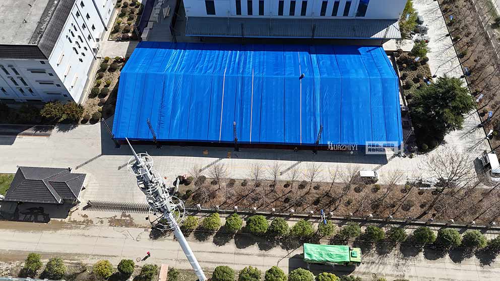 搭建過程中,工作人員們分工明確、配合默契。他們熟練地安裝桁架,仔細張貼藍色篷布,每一個細節都處理得一絲不茍。面對時間緊、任務重的挑戰,大家加班加點,克服了諸多困難,確保展篷按時高質量完成搭建。