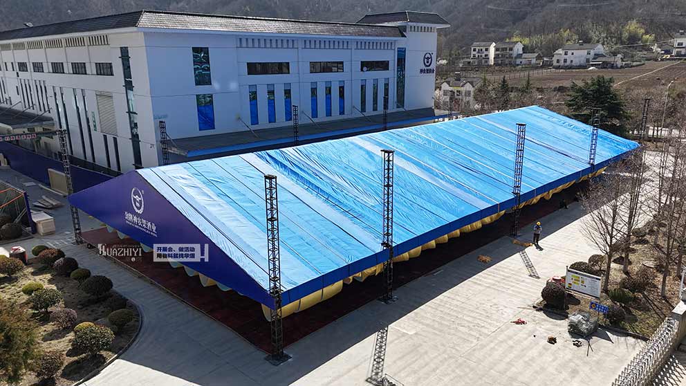 鄭州篷房出租助力搭建大型藍色桁架展篷。湖北神農架勁牌酒業廠區內,有一座大型藍色桁架展篷格外引人注目,而這背后離不開鄭州篷房出租公司的有力支持。