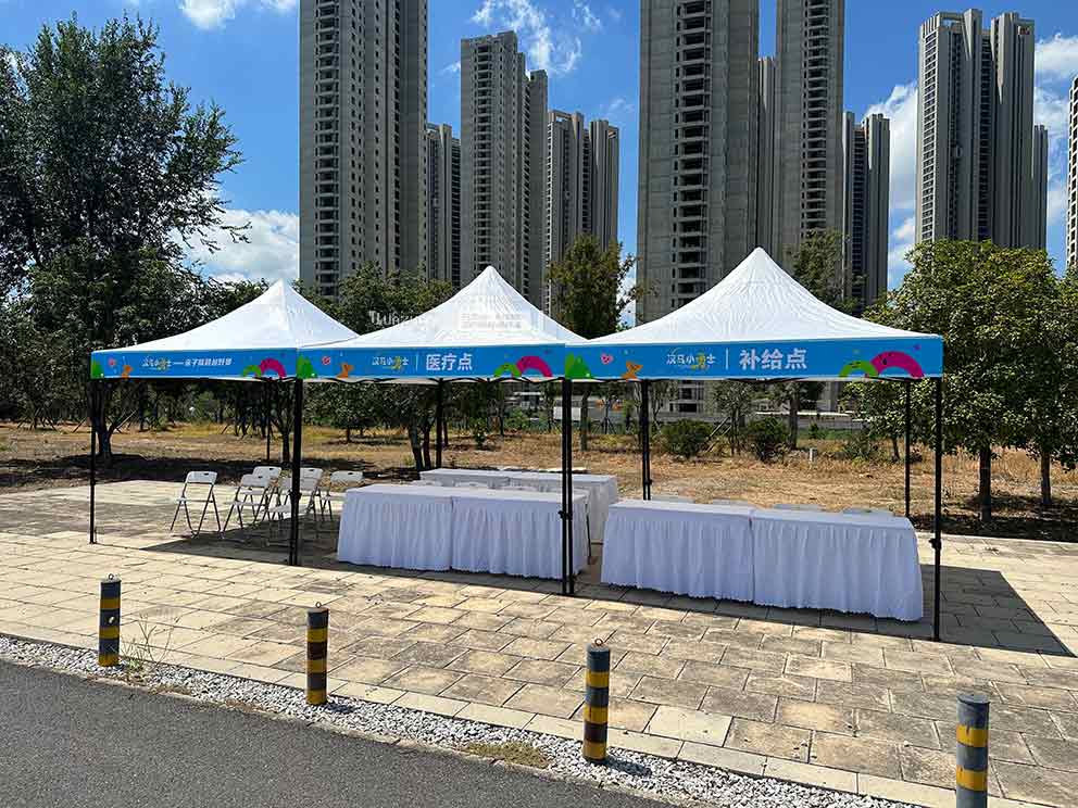 許昌鐵馬帳篷租賃搭建的帳篷為簡約的人字頂設(shè)計(jì),白色篷布經(jīng)過防水防曬處理,即便在烈日下也能保持篷內(nèi)涼爽。桁架則為賽事打造了鮮明的視覺焦點(diǎn)。許昌鐵馬帳篷租賃用桁架搭建起的背景架,架體覆蓋著噴繪畫面,上面印著“漢馬小勇士”的賽事LOGO與活力滿滿的親子越野圖案,成為整個(gè)賽場最醒目的標(biāo)識(shí)。桁架的搭建精準(zhǔn)把控高度與角度,既不會(huì)遮擋觀眾視線,又能與周圍的鐵馬、帳篷形成和諧的視覺搭配。