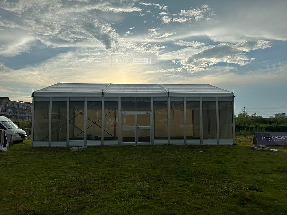 白色玻璃篷房,撐起“通透與格調并存”的核心展區。平頂山玻璃篷房租賃為本次試駕會定制的白色玻璃篷房,采用人字頂結構,頂篷選用高密度白色 PVC 面料,既具備出色的防曬防雨性能,又能在自然光下呈現出柔和的漫反射效果。篷房四周采用 8 毫米厚的雙層夾膠鋼化玻璃幕墻,透光率超 92%。篷房內的參與者可透過玻璃,將試駕場地的戶外風光盡收眼底,打破傳統封閉展廳的壓抑感。