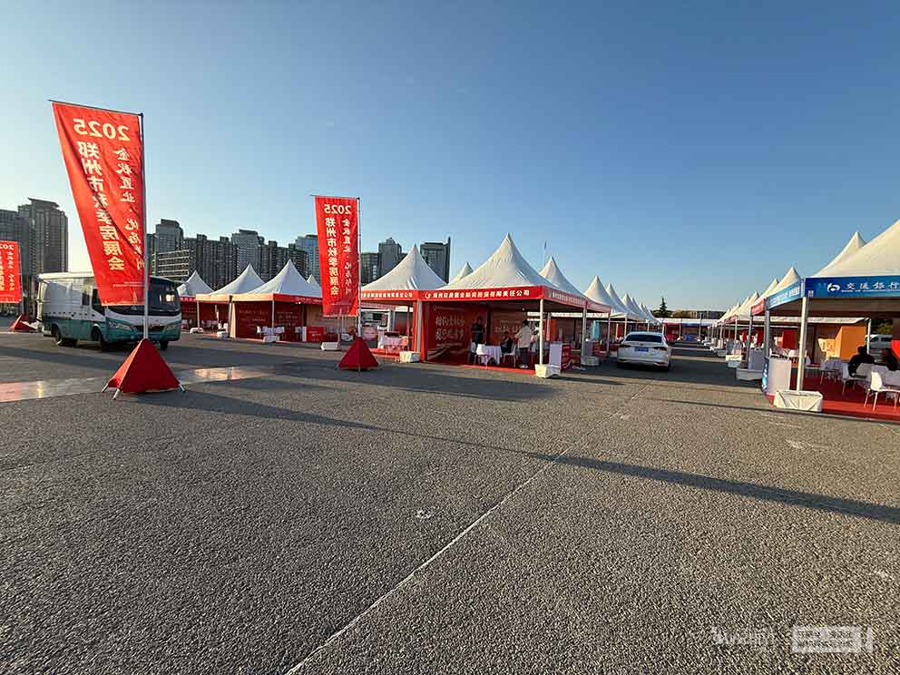為打破傳統(tǒng)展廳的封閉感,周口篷房桌椅租賃在展會(huì)核心區(qū)域搭建了白色尖頂篷房。純白篷布搭配輕量化鋁合金支架,造型輕盈靈動(dòng),在展會(huì)現(xiàn)場(chǎng)形成醒目的視覺標(biāo)識(shí)。多頂篷房沿主通道有序排列,既實(shí)現(xiàn)了參展房企的獨(dú)立展示,又通過開放式設(shè)計(jì)保持了展會(huì)整體的通透感,方便購房人群自由穿梭、對(duì)比咨詢。