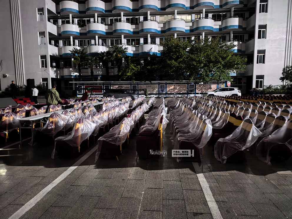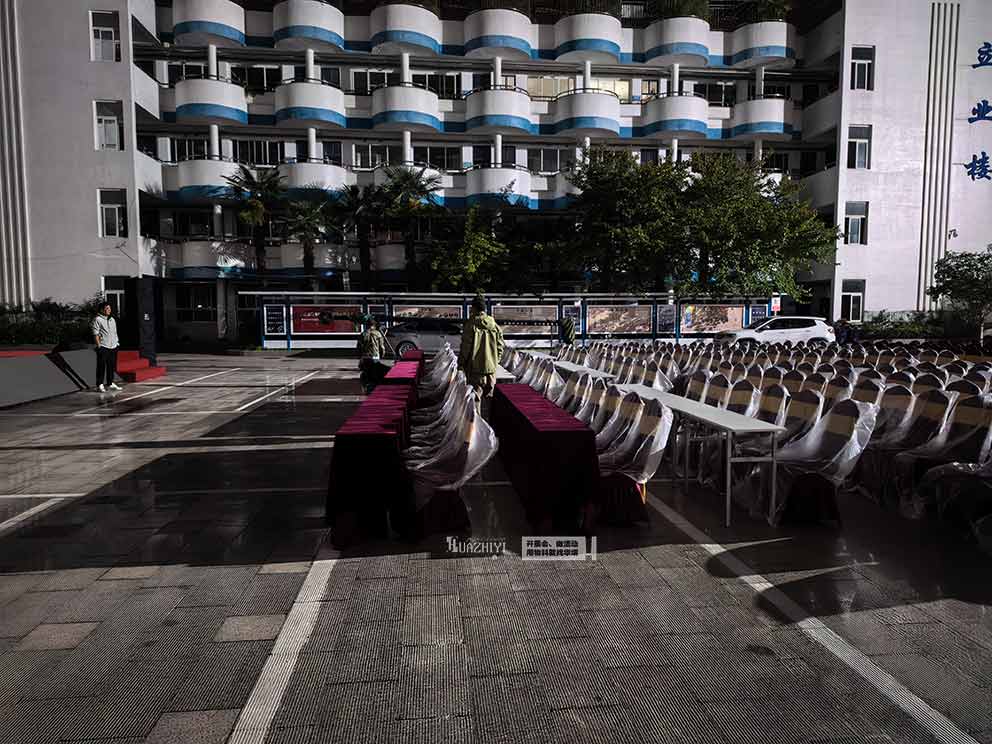 布場(chǎng)安排在校慶開始前一,天氣預(yù)報(bào)會(huì)下雨,開封桌椅租賃提前制定了周全的防雨預(yù)案。桌椅組裝排列完成后,團(tuán)隊(duì)迅速為每一把貴賓椅套上定制的透明防雨保護(hù)套保護(hù)套完全覆蓋椅身。布場(chǎng)過程中,團(tuán)隊(duì)成員分工明確,冒雨高效作業(yè),從桌椅搬運(yùn)、組裝到防雨保護(hù),每一個(gè)環(huán)節(jié)都有條不紊,確保在深夜雨勢(shì)增大前完成全部布場(chǎng)工作,用專業(yè)與擔(dān)當(dāng)應(yīng)對(duì)天氣挑戰(zhàn)。