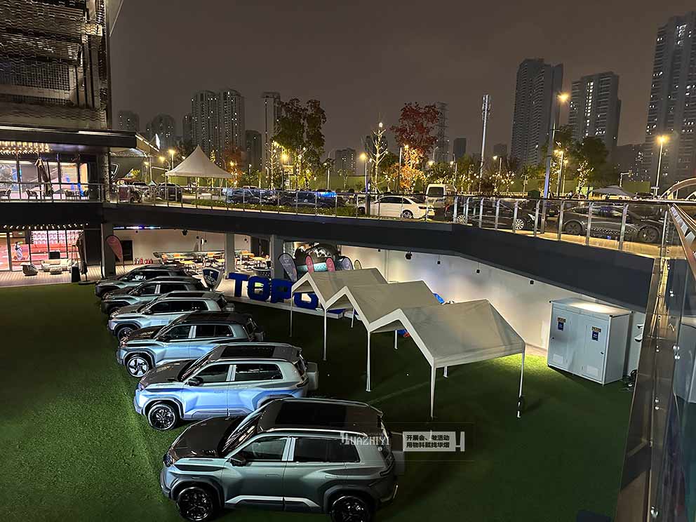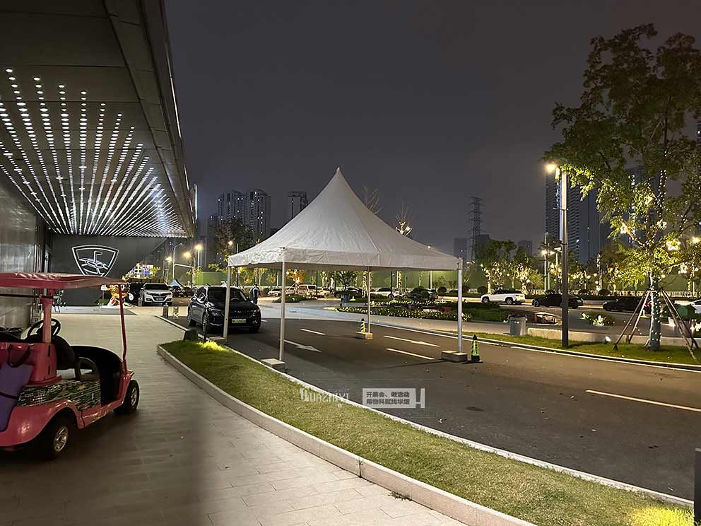 平頂山帳篷租賃布置的白色尖頂帳篷,成為活動現場的核心功能樞紐。帳篷采用高強度鋁合金支架,純白色尖頂造型簡約大氣,無四周篷布的開放式設計讓空間通透開闊,與高爾夫場地的綠意盎然形成鮮明而和諧的視覺搭配。尖頂帳篷的高挑空設計增強了空間層次感,頂部透光篷布引入自然光線,白天無需額外照明即可保持明亮,既方便參與者開展輕量互動,又能作為活動信息的臨時發布點,讓功能與氛圍完美融合。